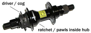holds the 3 or 4 pawls. On the inside of the hub shell is the ratchet that the